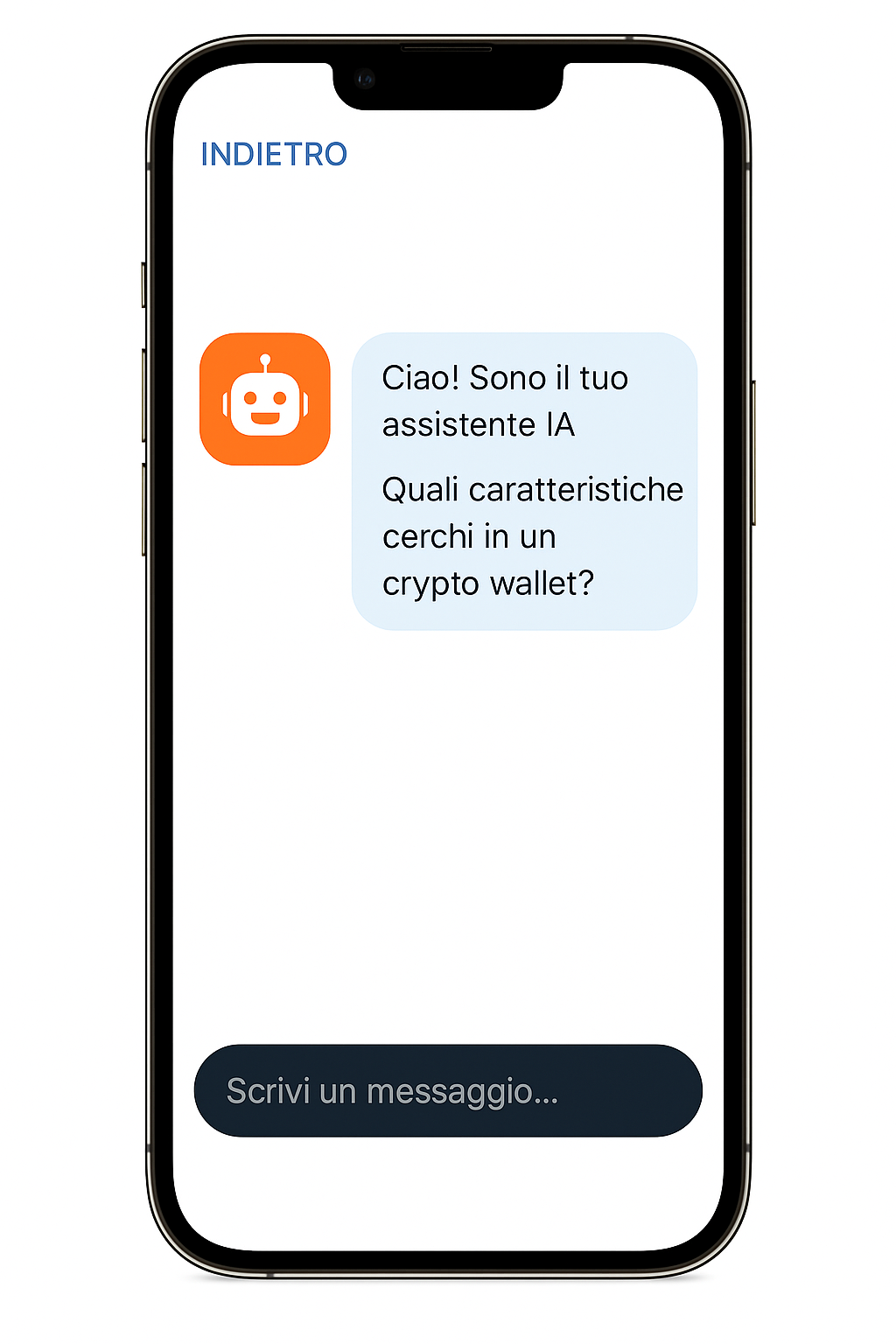 L'AI traduce le tue risposte in bisogni concreti: livello di sicurezza richiesto, grado di custodia, complessità accettabile, necessità di funzionalità DeFi, NFT, multi-chain e altro.